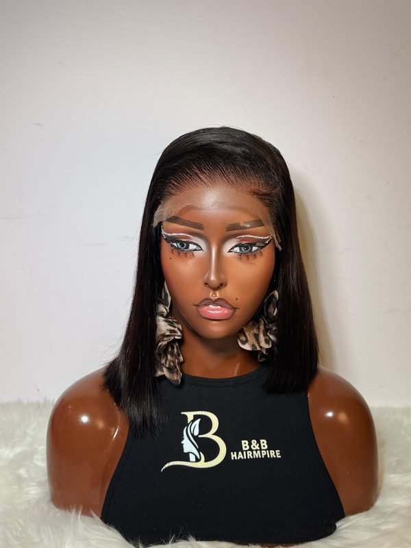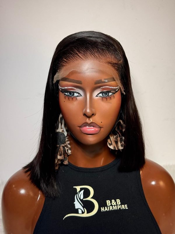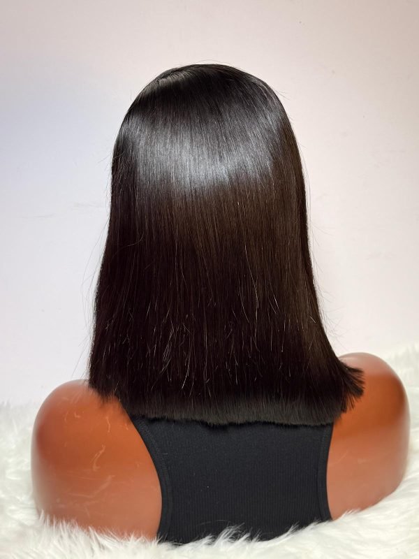 A 10-inch Super Double Drawn (SDD) Vietnam Bone Straight Wig (“Brigi Sleek”) in a sleek asymmetric bob style. Features a 6×6 glueless closure sewn at the side and 260g density, perfect for a chic, modern style.