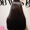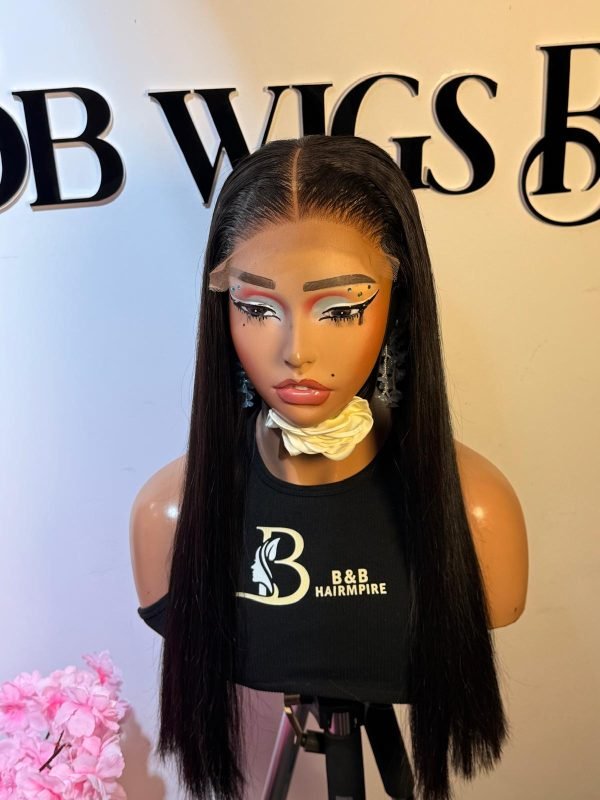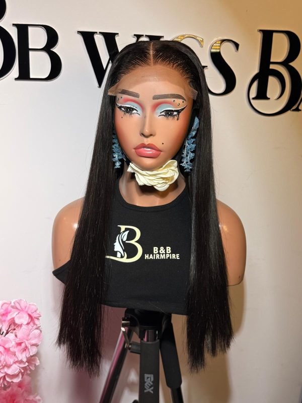 A sleek and elegant 18″ Vietnam donor bone straight wig with a glueless 5×5 transparent closure. Full, silky, and ready to wear—pure luxury in every inch.