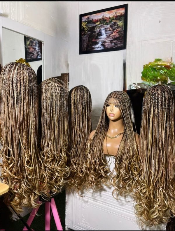 Full lace French curl braided wig in rich honey-blonde tones with soft curly ends. Glueless, natural-looking, and easy to maintain.